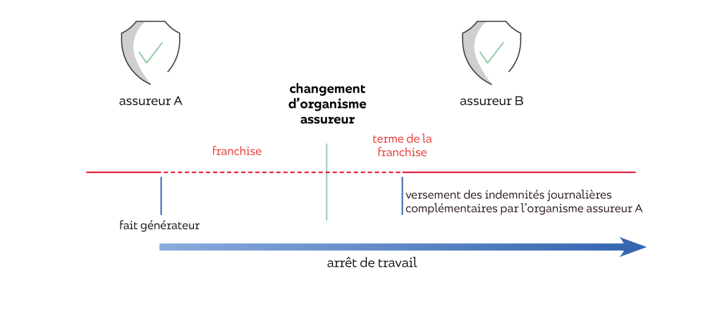 En conséquence, lors d’un changement d’organisme assureur avant l’expiration du délai de franchise afférent à un arrêt de travail, l’assureur résilié prend en charge les indemnités journalières complémentaires à l’issue de la franchise.